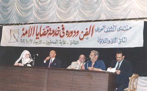 في ليلة فنية زاهية عقد منتدى المثقف العربى بنقابة الصحفيين لقاءه الثاني والثلاثين وسط كوكبة من الفنانين والمثقفين والمفكرين والأدباء وأرباب القلم والبيان من الشعراء والصحفيين حيث دار اللقاء حول محور هام أصبح ملحاً في الظروف الراهنة وهو : دور الفن في خدمة المجتمع.