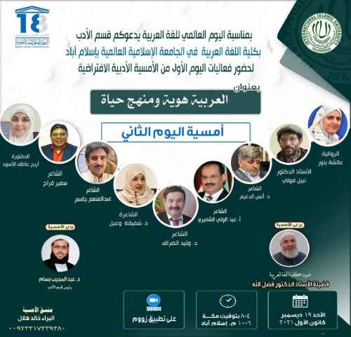 نظم قسم الأدب بكلية اللغة العربية, جامعة إسلام آباد, احتفالية افتراضية كبرى عبر منصة زووم, وجاء الاحتفالية في إطار الاحتفالات الدولية باليوم العالمي للغة العربية, أقيمت الاحتفالية يومي, السبت والأحد 18و19 ديسمبر 2021,
